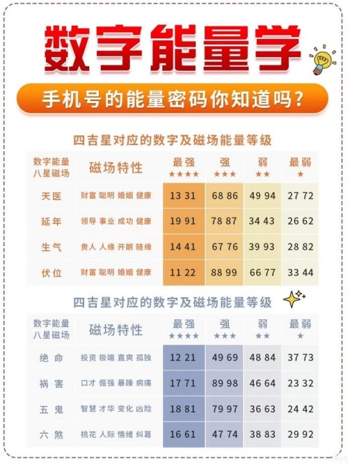 在数字能量学中,天医星是公认的“招财吉星”,很多人选手机号码时,都执着于堆砌天医星,甚至不惜高价寻找带有三个天医星的号码,认为天医星越多,财运就越旺。但事实真的如此吗?手机号码三个天医星到底好不好?一、天医星特性天医星是数字能量学中八大磁场之一,寓意是招财聚福、健康平安,同时也主人际关系和谐,是助力财运与生活顺遂的核心吉星。天医星的能量有强弱之分,不同等级的天医星,作用效果也截然不同,这也是判断三...
