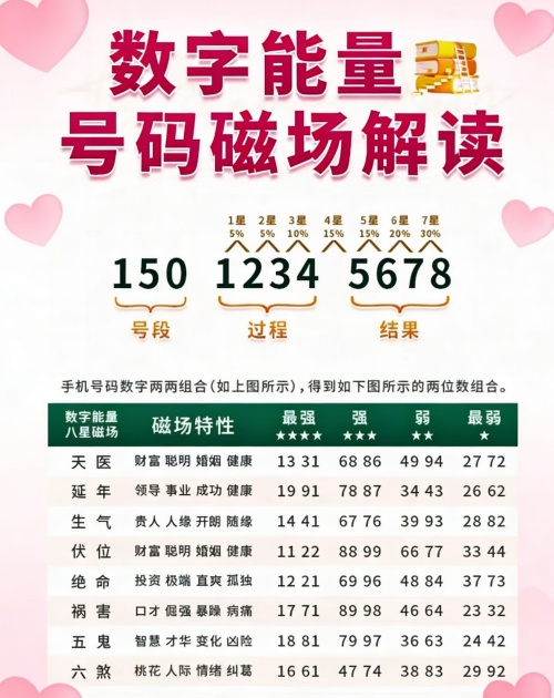 很多人选手机号码时,都有一个根深蒂固的误区:觉得吉星磁场越多,财运就越好,甚至不惜高价购买全是吉星组合的“靓号”,可使用后却发现,不仅没迎来财运,反而出现运势失衡、事事不顺的情况。手机号码的数字磁场讲究“平衡”,如同生活中“过犹不及”的道理,单一吉星叠加过多,只会打破磁场平衡,引发物极必反的效果。真正的好号码,核心是贴合自身情况,而非盲目堆砌吉星,这也是数字能量学的核心逻辑之一。1、全吉号引起物极...