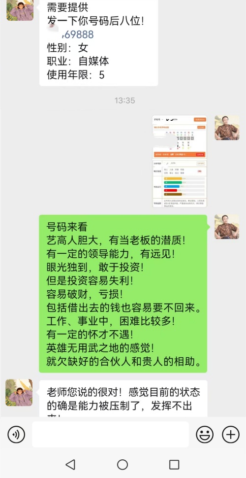 之前的一个客户是杭州做电商创业,八字喜火、忌水,前期盲目跟风,买了尾号9888的靓号。看似吉祥,实则踩了多个坑,尾数是五鬼+伏位磁场,凶星结尾。电商创业需天医+生气组合,该号码无生气星,且强磁场与初期创业的稳扎稳打需求不符。换号后3个月,生意逐渐回暖,客户量翻倍,真正实现了“大吉”的助力作用。